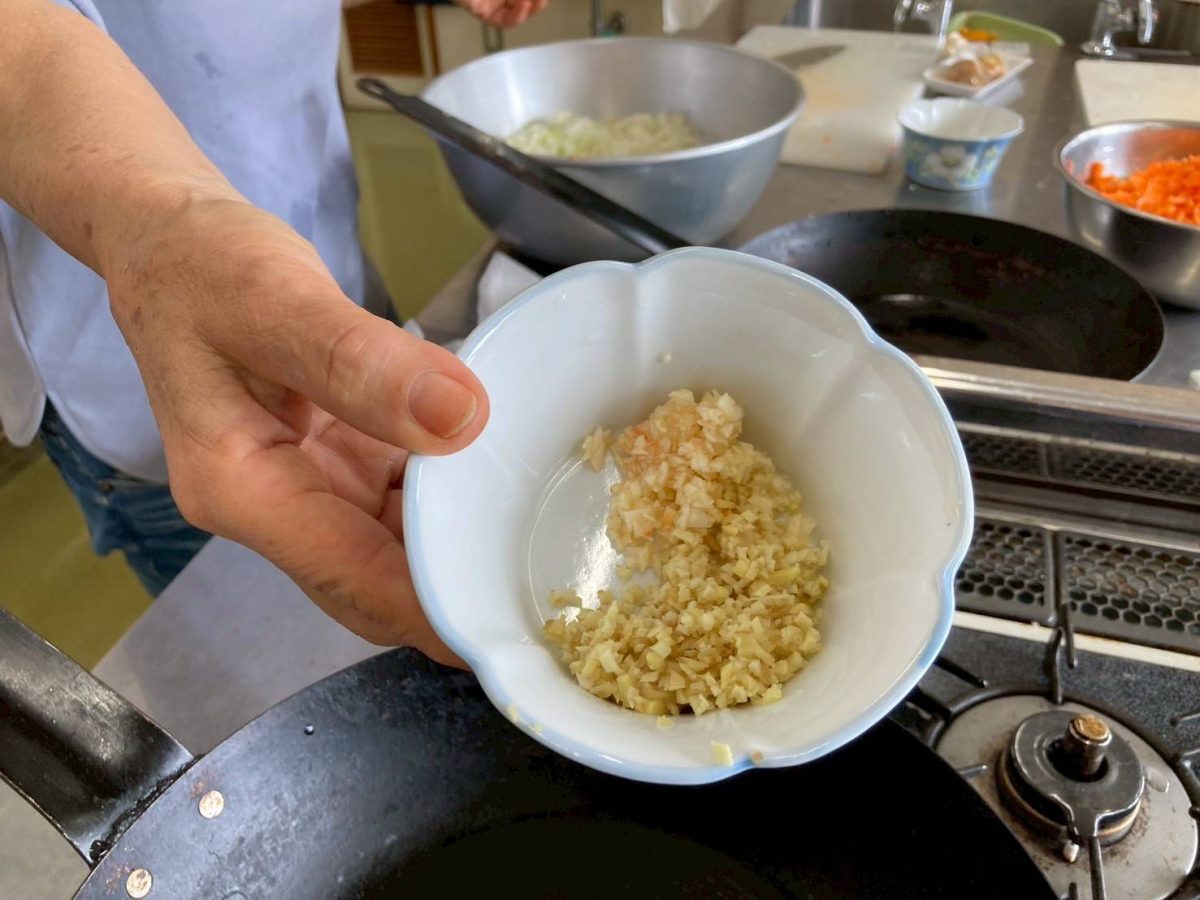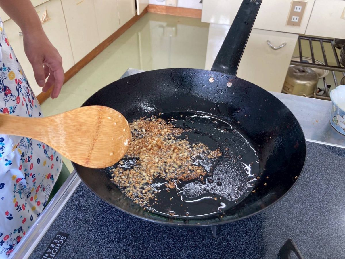 最初にショウガとニンニクを入れ、焦げ目がつくまで炒めます。