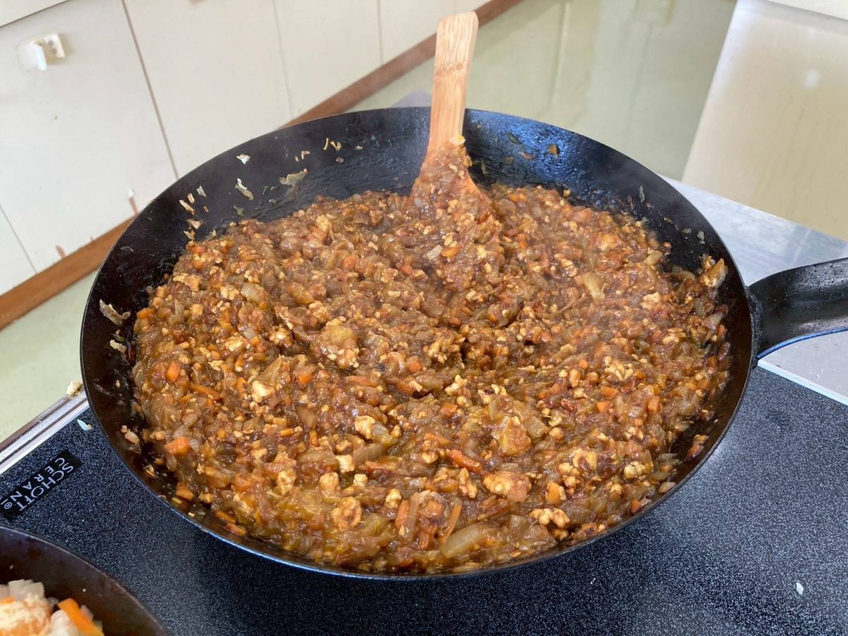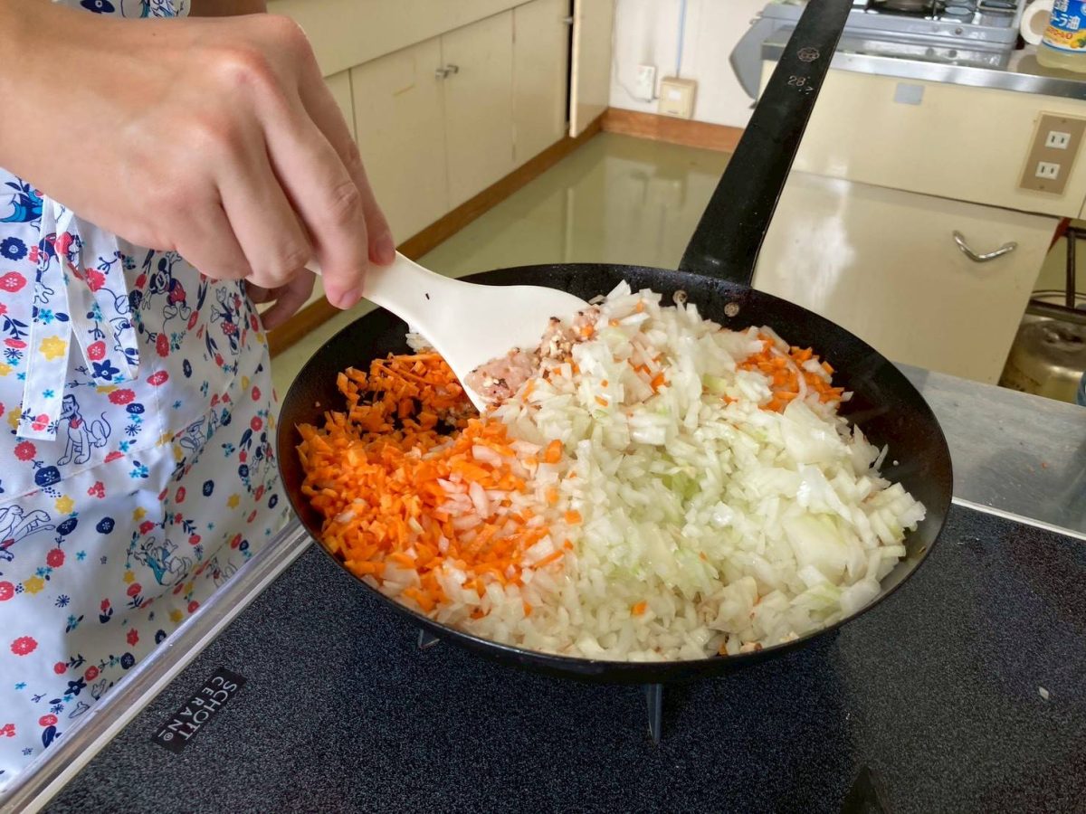 次に鶏ひき肉を加え、全体に焼き色がついたら玉ねぎと人参を加えて炒めます。