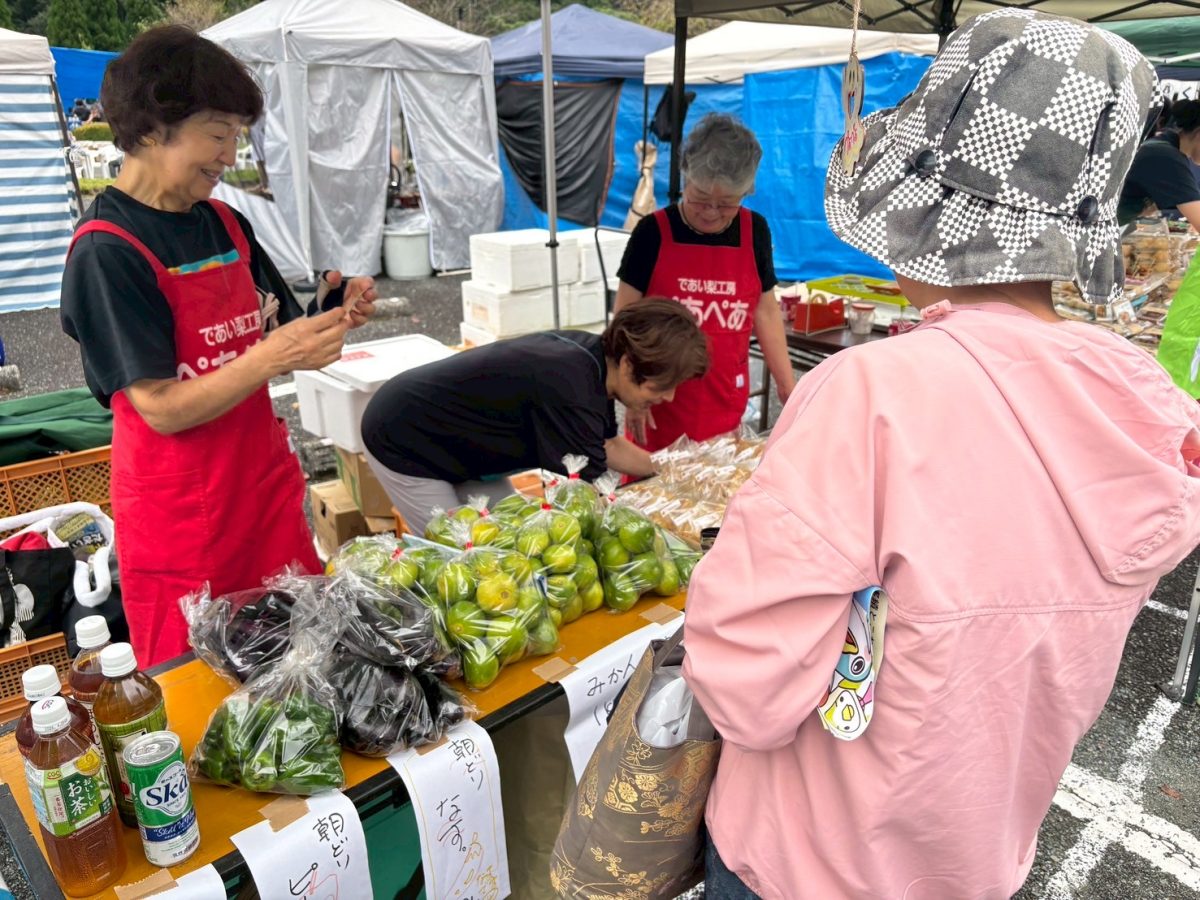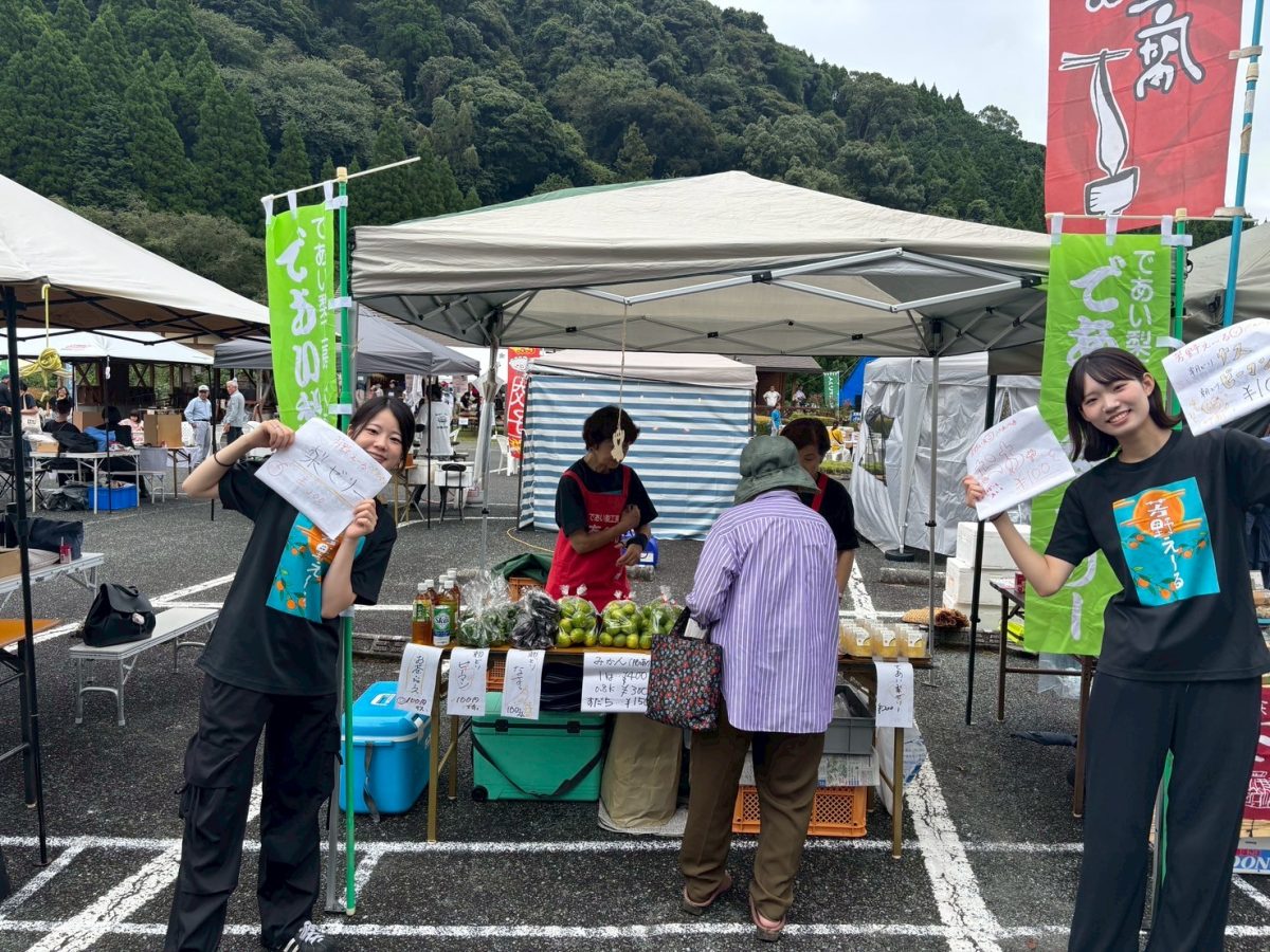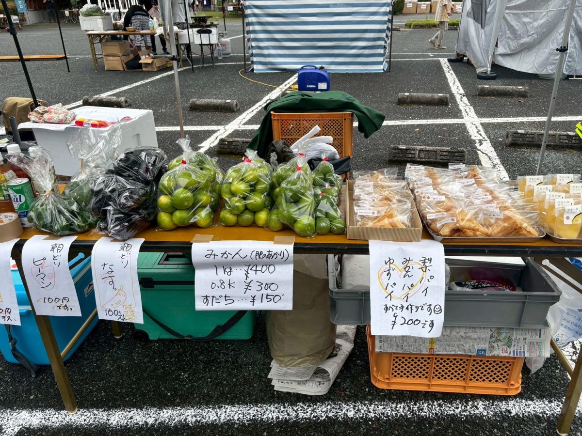 私たち芳野えーるは、芳野えーるの実行委員仲間でもある「であい梨工房ペアペア」さんのお手伝いとしてマルシェに参加し、新鮮なみかんや野菜、手作りのパイやゼリーを販売しました。少し雨模様でお客さんが来られるか心配でしたが、予想以上に多くの方が足を運んでくださり、準備したパイもゼリーも完売でした。