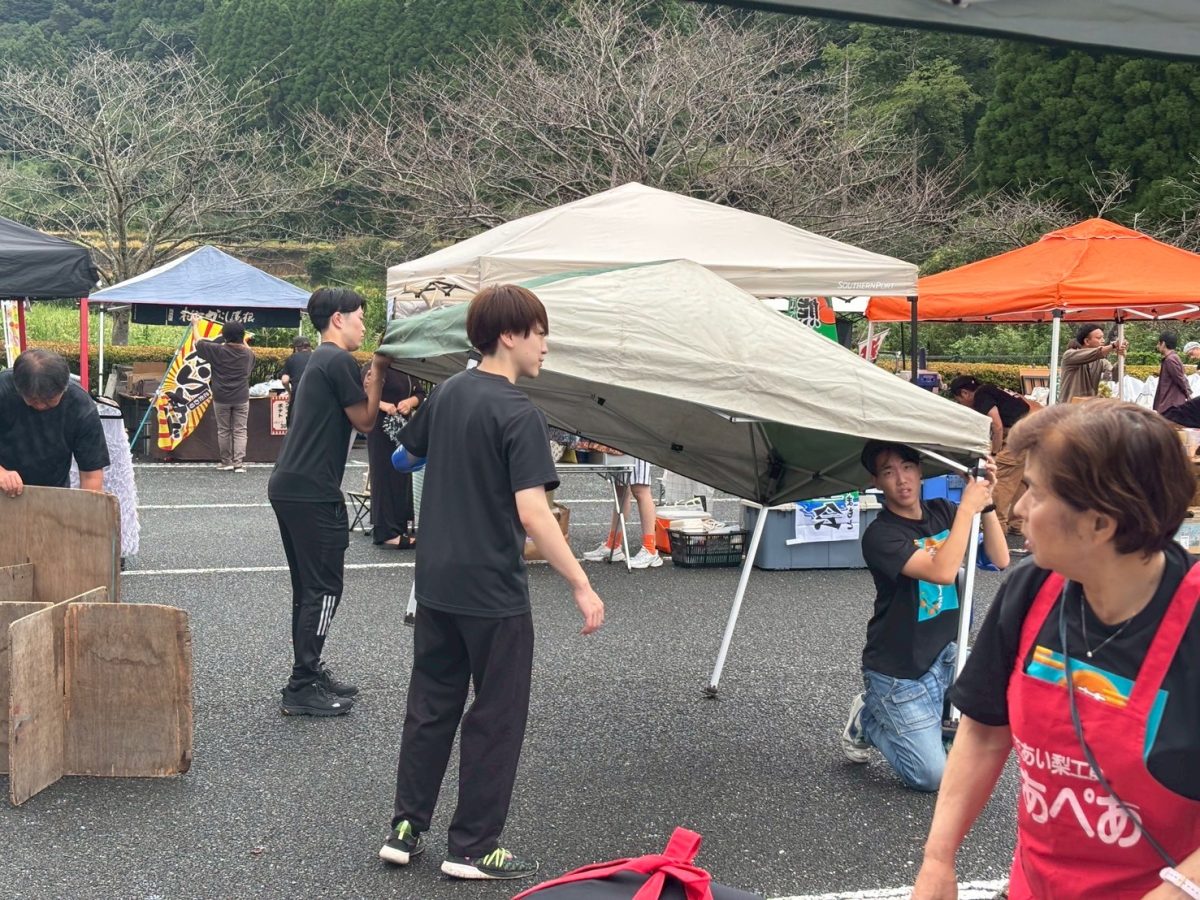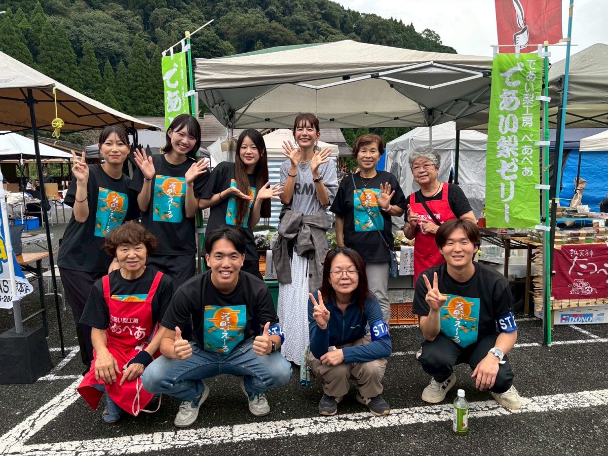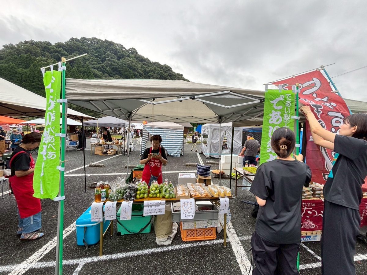 私たち芳野えーるは、芳野えーるの実行委員仲間でもある「であい梨工房ペアペア」さんのお手伝いとしてマルシェに参加し、新鮮なみかんや野菜、手作りのパイやゼリーを販売しました。少し雨模様でお客さんが来られるか心配でしたが、予想以上に多くの方が足を運んでくださり、準備したパイもゼリーも完売でした。