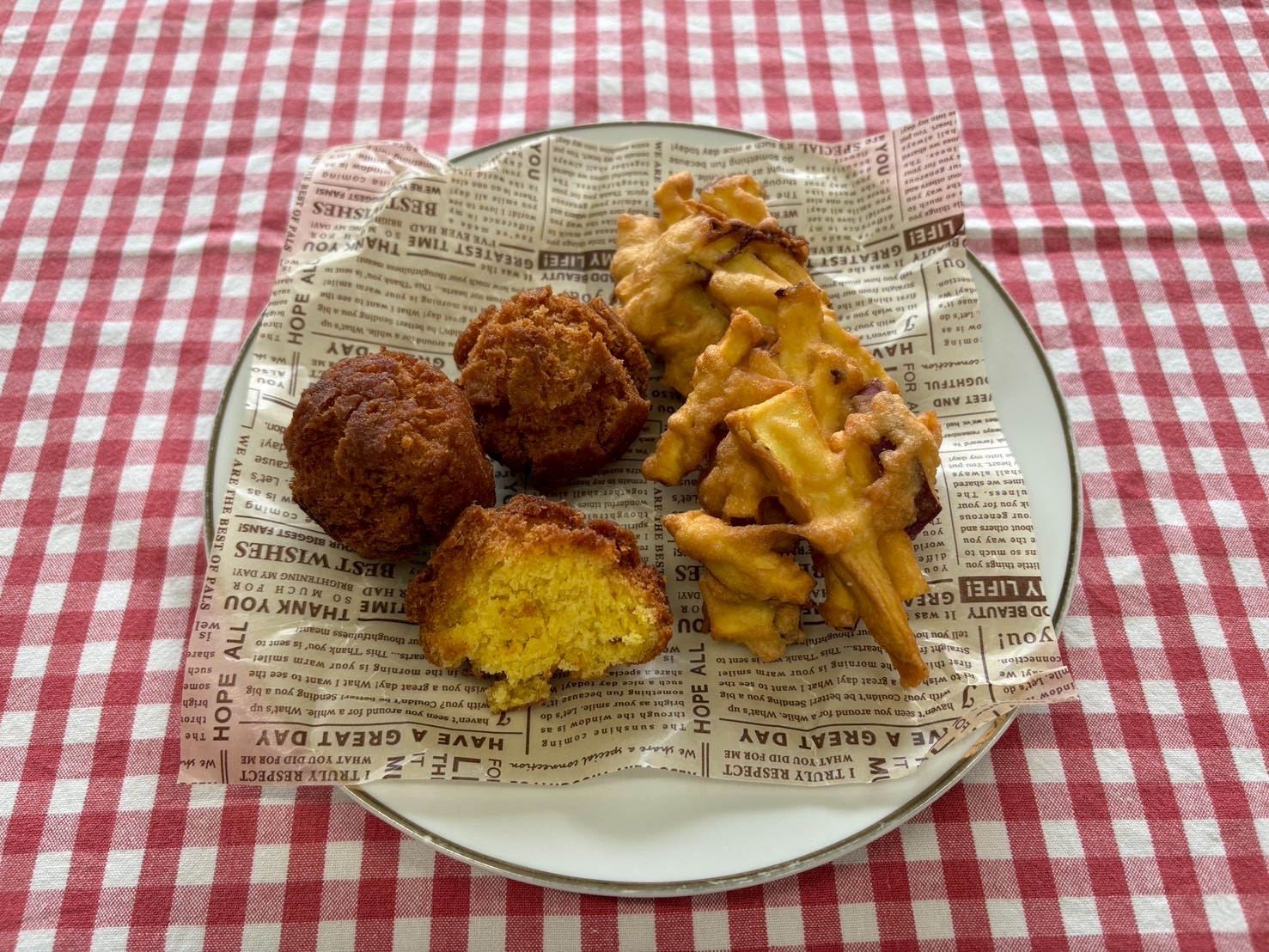 今回は芳野の特産みかんを使ってまずは「みかんペースト」を作り、それを使って「みかん風味のサーターアンダギー」、そしてサツマイモとみかんの皮で「がね揚げ」を作りました。