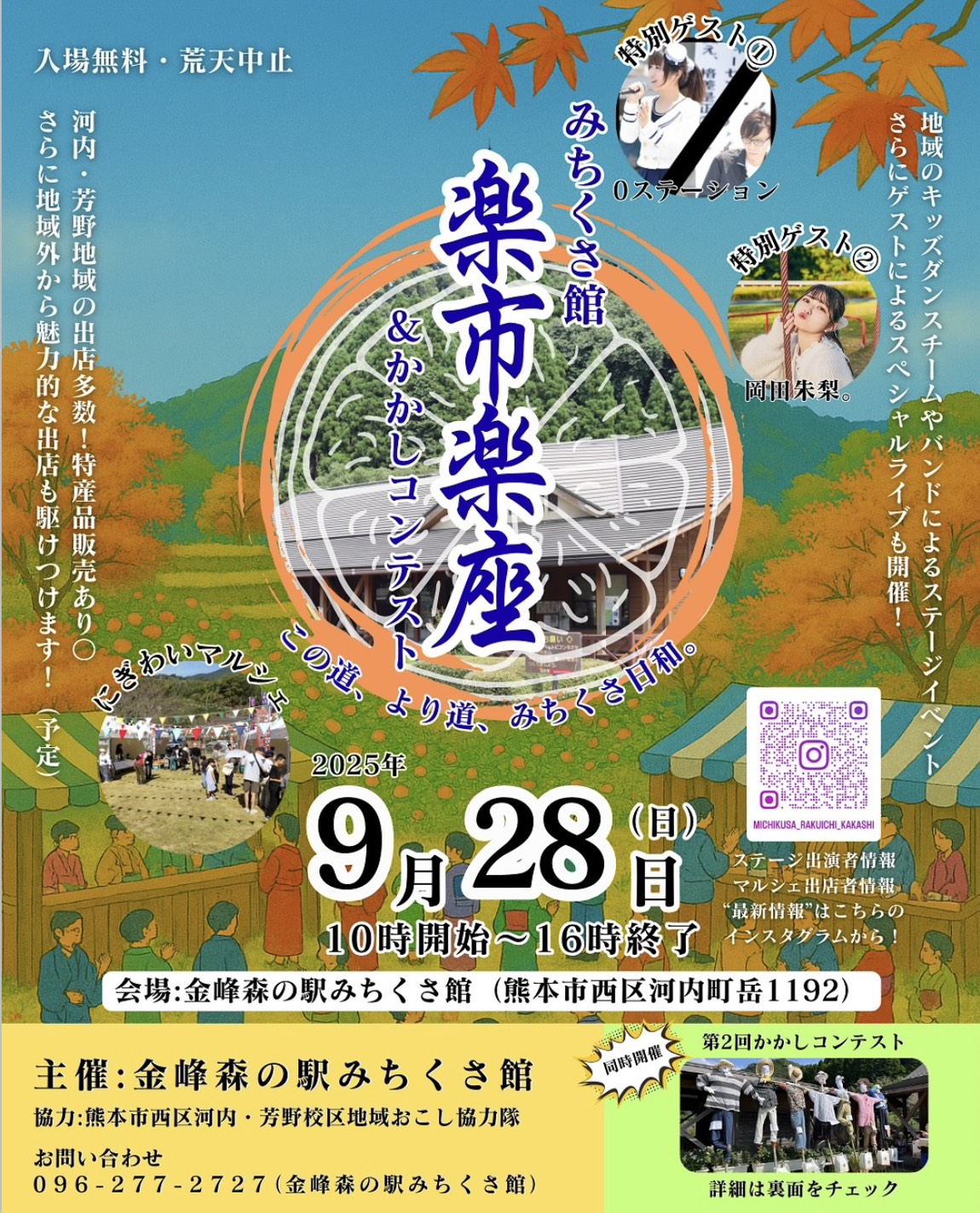 9月28日にみちくさ館で開催された「楽市楽座・かかしコンテスト」のお手伝いに芳野えーるとして参加してきました。地元の人の交流の場でもあり、数多くの出店やステージでのパフォーマンスもあってお天気は雨模様ではありましたが、にぎやかなイベントとなりました。